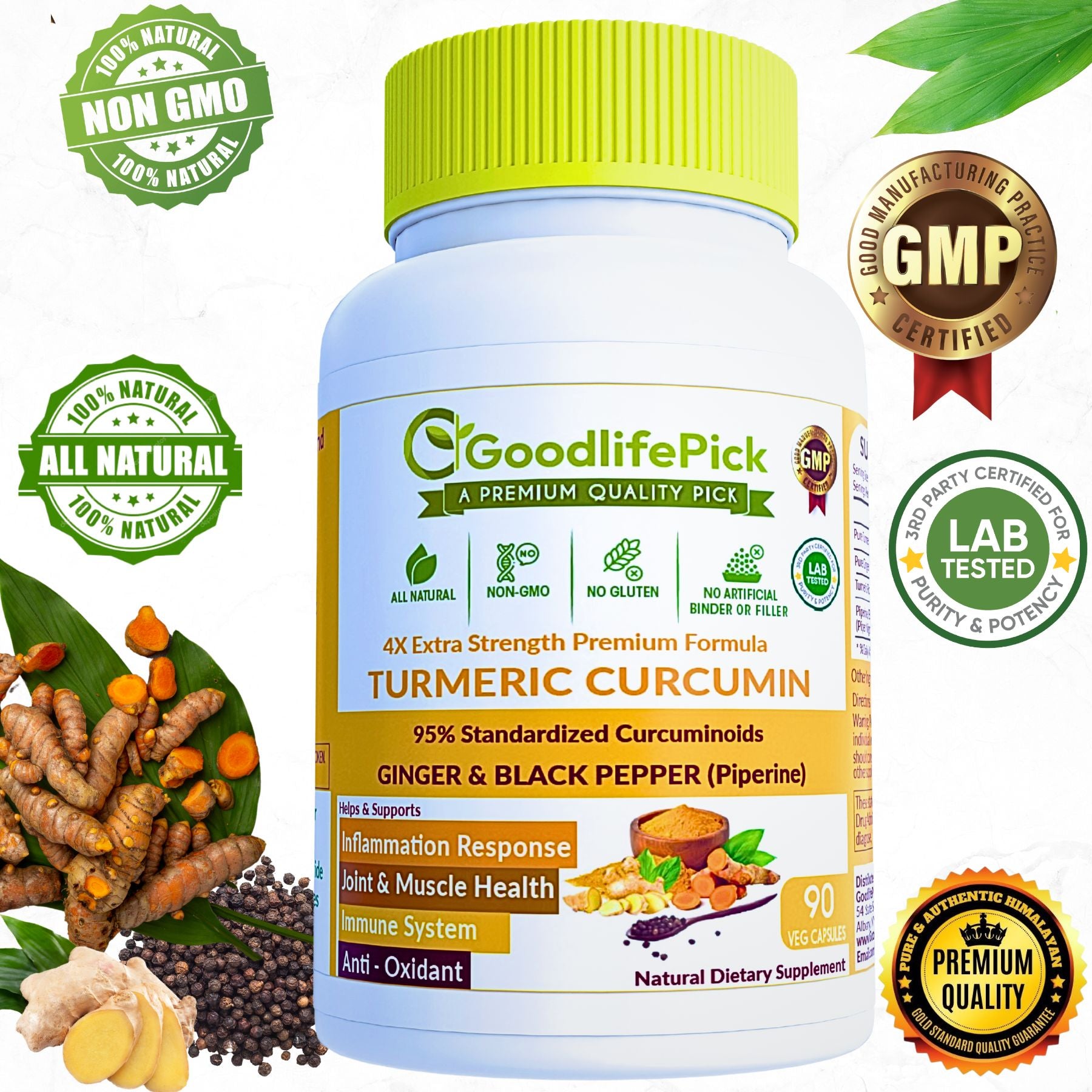 🌿 GoodlifePick 4X Potent Turmeric Curcumin & Ginger🌿Optimized for Maximum Strength, Benefits & Absorption. A Premium formula to supercharge your wellness Turmeric Curcumin with Ginger, packed with 95% Standardized Curcuminoids, and Black Pepper Extract for superior bioavailability and potency. Enhanced with Ginger root, this powerhouse supplement supports joint health, immune function, digestion, and a healthy inflammation response. Ultimate Blend with 4 Powerful Ingredients of Strength, Absorption, and Effectiveness—crafted to deliver full benefits of Turmeric Curcumin and Ginger for antioxidant defense, mobility, and overall well-being. Naturally potent. Scientifically optimized. Transform your health today!